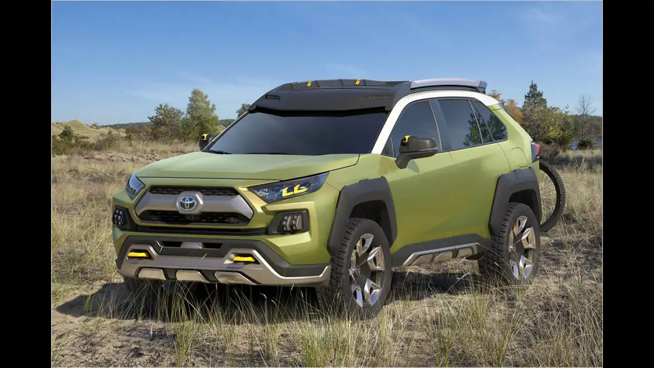 Kanufahrt, Mountain-Bike-Tour, Kletterausflug: Der FT-AC soll so vielfältig wie die Freizeitgestaltung nach einer harten Arbeitswoche sein. Dabei sind die Buchstaben nicht einfach eine zufällige Kombination aus lateinischen Lettern, sie stehen für ,Future Toyota Adventure Concept". Die Optik soll auf diese Anpassungsfähigkeit des SUVs … Achtung … angepasst sein. Die Lackierung ist in auffälligem Grün gehalten, dazu gesellen sich graue Akzente, grobschlächtige Karosserie-Beplankungen und ein markanter Unterfahrschutz. LED-Beleuchtung, einen Fahrradträger, einen Dachgepäckträger und stattliche 20-Zoll-Felgen mit All-Terrain-Bereifung spendiert Toyota ebenfalls.